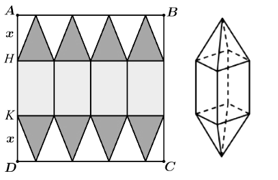 Bạn Minh dùng một miếng bìa hình vuông ABCD cạnh bằng 40cm và cắt theo đường nét đứt (như hình vẽ) để làm một chiếc đèn lồng gồm ba phần: Phần thân của đèn là một hình lăng trụ tứ giác đều, hai đầu của chiếc đèn là hai hình chóp tứ giác đều. Biết $AH = KD$, thể tích lớn nhất của chiếc đèn bằng bao nhiêu $cm^{3}$? (Không làm tròn kết quả các phép tính trung gian, chỉ làm tròn kết quả cuối cùng đến hàng đơn vị).