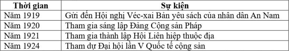 | b) Bảng thông tin phản ánh những hoạt động của Nguyễn Ái Quốc trong hành trình tìm đường cứu nước. | ||