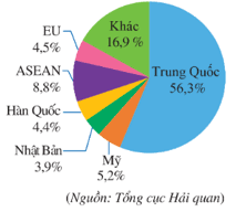 Cho biểu đồ thể hiện cơ cấu (tỷ trọng %) theo thị trường/quốc gia trong một tổng thể (nguồn: Tổng cục Hải quan).