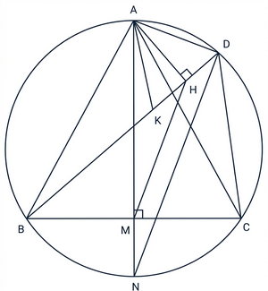 c) Tạo điểm phụ K trên BD sao cho BK = CD. Chứng minh tam giác ABK bằng tam giác ACD để tạo tam giác ADK cân. Tận dụng cặp tam giác đồng dạng AHD và AMC để đưa tỉ số độ dài về tỉ số lượng giác.