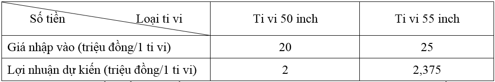 Một cửa hàng điện tử dự định sử dụng số vốn ban đầu không vượt quá 2 tỉ 750 triệu đồng để nhập về hai loại ti vi: loại 50 inch và loại 55 inch. Giá nhập và lợi nhuận dự kiến của mỗi loại ti vi được tính trong bảng sau: