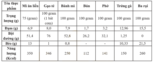 - Đọc dữ liệu cột "Trọng lượng (g)" và cột "Năng lượng (Kcal)" của các loại thực phẩm.