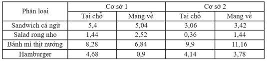 Doanh thu (triệu đồng) từ việc bán các loại đồ ăn sáng tại một cửa hàng bánh mì ở hai cơ sở trong tháng 6/2024 được cho như bảng dưới đây.