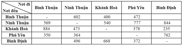 Biết rằng, tổng lượt khách đến Bình Thuận, Khánh Hòa, Phú Yên là 6171 lượt. Khách đi từ Ninh Thuận đến Bình Thuận ít hơn 60% so với khách đi từ Bình Thuận đến Bình Định. Khách đi từ Bình Định đến Bình Thuận nhiều hơn khách đi từ Khánh Hòa đến Phú Yên là 347 lượt.