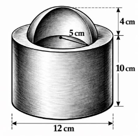 Một cơ sở thủ công mỹ nghệ ở Khánh Hòa sản xuất các chân đế kim loại để trưng bày quả cầu pha lê trong cửa hàng lưu niệm. Ban đầu, người ta đúc một khối kim loại hình trụ đặc có đường kính đáy 12 cm và chiều cao 10 cm. Sau đó, để đặt vừa quả cầu pha lê, người thợ khoét ở mặt trên của khối trụ một phần của khối cầu bán kính 5 cm. Phần của khối cầu nhô lên khỏi mặt trên của khối trụ 4 cm như hình minh họa. Biết thể tích kim loại còn lại của chân đế sau khi khoét là $m\pi$ $\left(cm^3 \right)$. Giá trị của m là bao nhiêu?