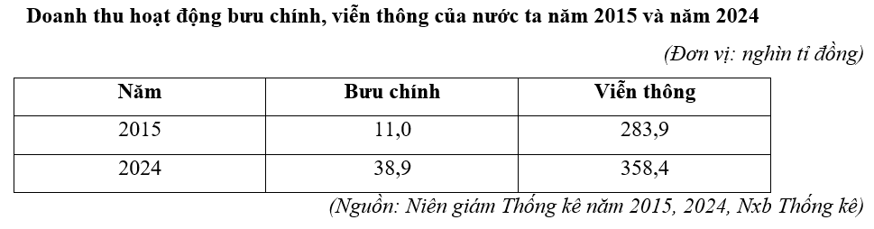 Căn cứ vào bảng số liệu, hãy cho biết chênh lệch tốc độ tăng trưởng năm 2024 so với năm 2015 giữa doanh thu bưu chính với doanh thu viễn thông của nước ta là bao nhiêu % (làm tròn kết quả đến hàng đơn vị).