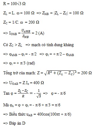 Đoạn mạch điện xoay chiều A, B gồm một điện trở thuần R = 100√3 Ω, cuộn thuần cảm L = 1/π (H) nối tiếp với tụ có điện dung C = 15,9 μF theo đúng thứ tự. Gọi M là điểm nối giữa R và L. Đặt vào hai đầu A, B điện áp xoay chiều thì thấy điện áp hai đầu MB có dạng uMB = 200cos(100πt – π/6) (V). Lấy 1/π = 0,318. Biểu thức điện áp hai đầu A, B của mạch là: