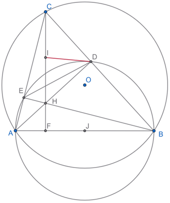 Cho đường tròn (O; R) cố định và hai điểm A, B cố định trên đường tròn đó ($AB \neq 2R$). Một điểm C di động trên (O; R) sao cho tam giác ABC nhọn. Các đường cao AD, BE, CF cắt nhau tại H. Gọi I là trung điểm của HC. Chứng minh rằng: