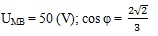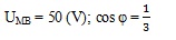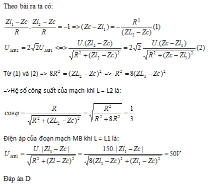 Đặt điện áp xoay chiều có giá trị hiệu dung không đổi 150 V vào đoạn mạch AMB gồm đoạn mạch AM chỉ chứa điện trở thuần R, đoạn mạch MB chứa tụ điện mắc nối tiếp với cuộn thuần cảm thay đổi được L. Biết khi L = L2 thì điện áp hiệu dụng hai đầu đoạn mạch MB tăng 2√2 lần so với khi L = L1 và dòng điện trong hai trường hợp lệch pha nhau góc π/2. Tìm hiệu điện thế đặt vào hai đầu đoạn mạch MB khi L = L1. Tính hệ số công suất của mạch khi L = L2.
