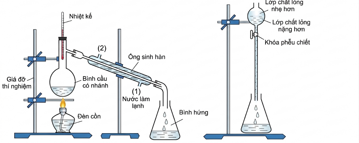 Bước 2: Lắp nhiệt kế ở miệng bình cầu, lắp sinh hàn thẳng vào nhánh bình cầu, lắp bình hứng sản phẩm như hình vẽ.