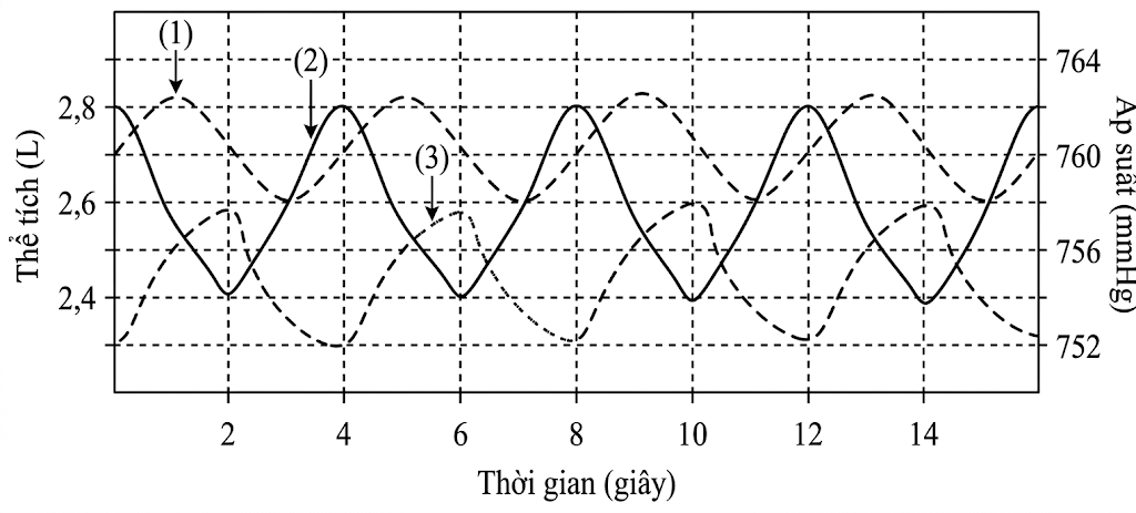Dựa vào sơ đồ sự thay đổi áp suất phổi (1); thể tích phổi (2) và áp suất khoang màng phổi (3) của người bình thường khi nghỉ ngơi.