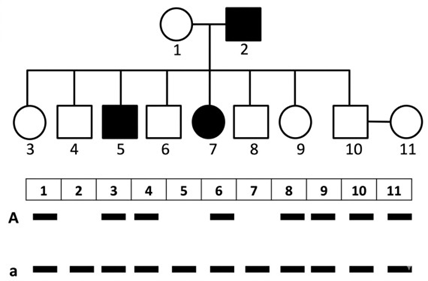 Phả hệ hình bên cho thấy sự di truyền của một tính trạng bệnh X do một gene có hai allele là A và a quy định. Kết quả điện di dưới phả hệ cho biết kiểu gene tương ứng của các cá thể 1 → 11; dấu ngang đậm thể hiện trong kiểu gene có allele tương ứng. Xác suất để cặp vợ chồng số (10) và (11) sinh con gái đầu lòng bị bệnh X là bao nhiêu %? (làm tròn kết quả cuối cùng đến hàng phần mười).