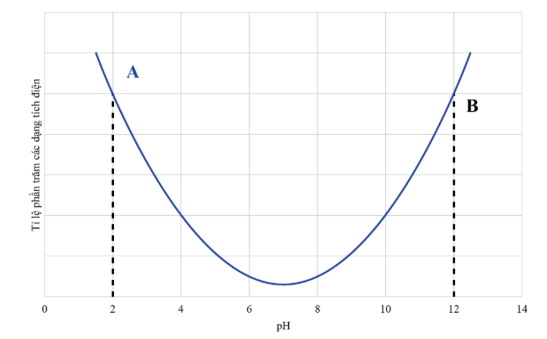 Glycine là một loại amino acid chứa 1 nhóm COOH và 1 nhóm NH2. Biết điểm đẳng điện (pI) là giá trị pH của dung dịch mà tại đó amino acid tồn tại ion lưỡng cực và tổng điện tích dương bằng tổng điện tích âm. Hình dưới đây cho thấy tỉ lệ phần trăm các dạng điện tích của glycine ở các giá trị pH khác nhau: