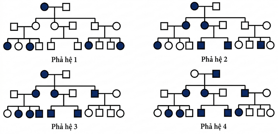 Hội chứng KeRNAS-Sayre là một đặc điểm di truyền hiếm gặp do mất khoảng 10.000 nucleotide khỏi DNA ty thể. Hầu hết những người mắc hội chứng này đều có cơ mắt yếu, mí mắt sụp xuống, giảm thị lực và thường có vóc dáng thấp bé. Phả hệ nào sau cho thấy một gia đình bị ảnh hưởng bởi hội chứng KeRNAS-Sayre rõ ràng nhất (người bị bệnh tô màu đen, người không bị bệnh là không tô) và không có đột biến mới sinh?