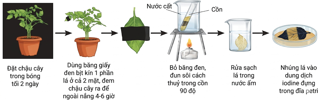 Hình ảnh sau mô tả các bước thí nghiệm chứng minh sự hình thành tinh bột trong quang hợp ở