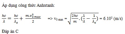 Kim loại làm catot của một tế bào quang điện có giới hạn quang điện là 240 nm. Khi được chiếu sáng bằng bức xạ có bước sóng bằng 0,2 μm thì vận tốc ban đầu cực đại của quang electron là:
