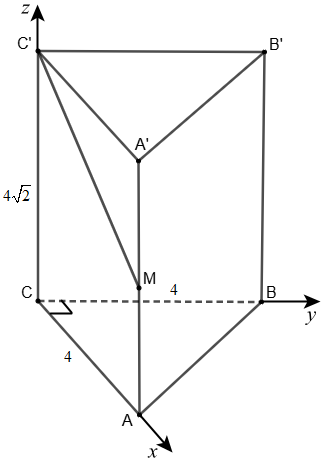 Cho khối lăng trụ đứng ABC.A'B'C' có độ dài cạnh bên bằng $4\sqrt{2}$ và đáy là tam giác ABC vuông cân tại C, có $AC = 4$. Gọi M là trung điểm của cạnh AA', tính khoảng cách giữa hai đường thẳng C'M và AB (không làm tròn ở các bước trung gian).