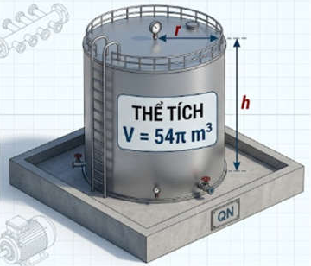 Một đại lý xăng dầu tại Quảng Ngãi cần làm một bồn chứa dầu hình trụ bằng tôn có thể tích $V = 54\pi$ $(m^{3})$. Gọi r, h lần lượt là bán kính đáy và chiều cao của cái bồn dầu.
