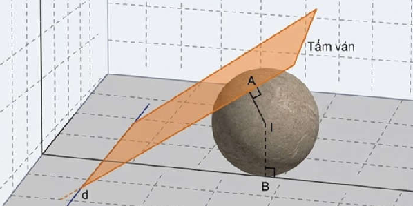 Xét một hệ trục tọa độ Oxyz được cho sẵn, đơn vị trên mỗi trục là dm, mặt ngoài của một cục đá có dạng hình cầu được mô hình hóa bởi phương trình mặt cầu ${(x - 2)}^{2} + {(y + 1)}^{2} + {(z + 1)}^{2} = 6$, cục đá nằm yên trên sàn nhà. Người ta nhìn thấy một tấm ván ngã xuống đè lên cục đá, phần giao của tấm ván và sàn nhà là đường thẳng d có phương trình $\dfrac{x + 2}{2} = \dfrac{y + 1}{- 3} = \dfrac{z}{1}$. Gọi A, B lần lượt là hai tiếp điểm của tấm ván, sàn nhà với cục đá và I là tâm cục đá (hình vẽ minh họa).