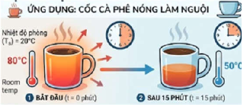 Một cốc cà phê nóng có nhiệt độ ban đầu là $80^{o}C$ được đặt trong một phòng có nhiệt độ ổn định là $20^{o}C$. Sau 15 phút, nhiệt độ của cốc cà phê giảm xuống còn $50^{o}C$ (hình vẽ minh họa). Gọi $T(t)$ là nhiệt độ của cốc cà phê tại thời điểm t (phút) và $y(t) = T(t) - 20$ là chênh lệch nhiệt độ giữa cà phê và môi trường. Biết rằng tốc độ thay đổi chênh lệch nhiệt độ tỉ lệ thuận với chính nó, tức là $y'(t) = k.y(t)$ (với k là hằng số).