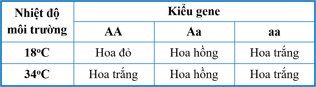 Ở một loài thực vật lưỡng bội, allele A quy định hoa đỏ, a quy định hoa trắng. Sự biểu hiện kiểu hình của các kiểu gene quy định màu hoa phụ thuộc vào nhiệt độ và thể hiện trong Bảng 2: