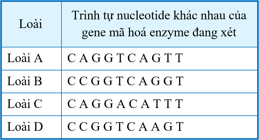 Cho biết gene mã hóa cùng một loại enzyme ở một số loài chỉ khác nhau ở trình tự nucleotide sau đây:
