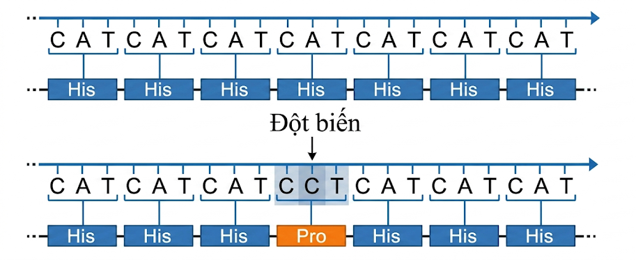 Hình dưới đây mô tả một đột biến điểm xảy ra trong một bộ ba trên mạch khuôn của một gene. Quan sát hình và cho biết dạng đột biến gene thuộc loại nào sau đây?