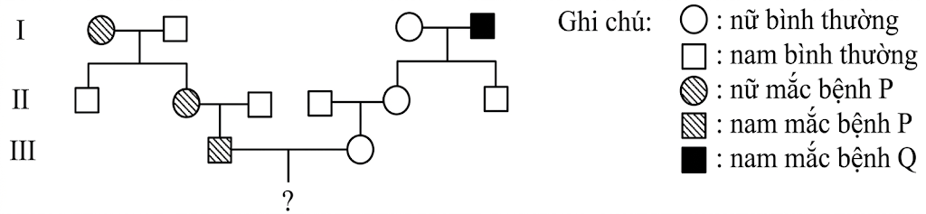 Bệnh P được quy định bởi gene trội nằm trên nhiễm sắc thể thường; bệnh Q được quy định bởi gene lặn nằm trên nhiễm sắc thể giới tính X, không có allele tương ứng trên Y. Biết rằng không có đột biến mới xảy ra. Cặp vợ chồng ở thế hệ III trong sơ đồ phả hệ trên muốn sinh con đầu lòng là con trai nhưng họ sợ con bị mắc bệnh, hãy tính xác suất họ sinh con trai mắc cả hai bệnh P và Q là bao nhiêu?