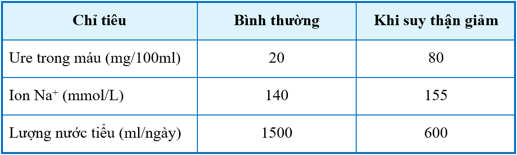 Bảng dưới đây cho biết nồng độ một số chất trong máu của một động vật ở trạng thái bình thường và khi chức năng thận bị suy giảm: