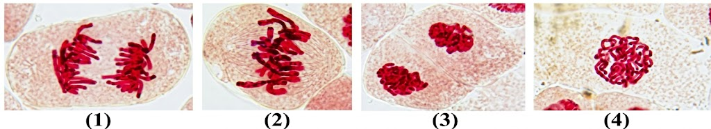 Các hình sau thể hiện các giai đoạn (chưa theo thứ tự) của quá trình phân bào ở tế bào rễ cây hành ta (Allium fistulosum).