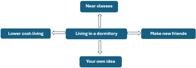 Part 3. Topic developmentThere are some benefits of living in a dormitory.Follow-up questions:- Do you like living in a