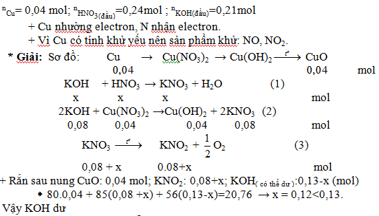 Cho 2,56 gam kim loại Cu phản ứng hoàn toàn với 25,2 gam dung dịch HNO3 60% thu được dung dịch A. Biết rằng nếu thêm 210ml dung dịch KOH 1M vào A rồi cô cạn và nung sản phẩm thu được tới khối lượng không đổi thì được 20,76 gam chất rắn. Hãy xác định A, C% Cu(NO3)2 là bao nhiêu?