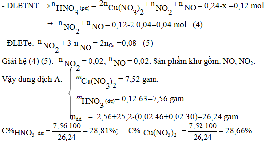 Cho 2,56 gam kim loại Cu phản ứng hoàn toàn với 25,2 gam dung dịch HNO3 60% thu được dung dịch