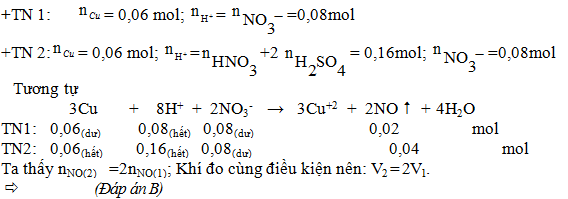 Thực hiện hai thí nghiệm: TN 1: Cho 3,84 gam Cu phản ứng với 80 ml dung dịch HNO3 1M thoát ra V1 lít