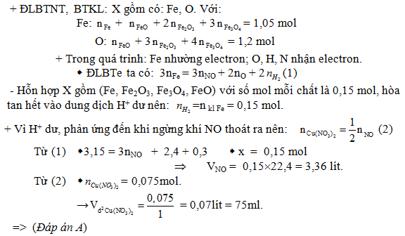Hỗn hợp X gồm (Fe, Fe2O3, Fe3O4, FeO) với số mol mỗi chất là 0,15 mol, hòa tan hết vào dung dịch Y gồm (HCl và H2SO4 loãng) dư thu được dung dịch Z. Nhỏ từ từ dung dịch Cu(NO3)2 1M vào dung dịch Z cho tới khi ngưng thoát khí NO. Thể tích dung dịch Cu(NO3)2 cần dùng và thể tích khí thoát ra ở đktc là