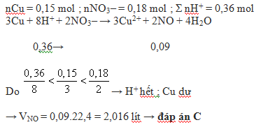 Hòa tan 9,6 gam Cu vào 180 ml dung dịch hỗn hợp HNO3 1M và H2SO4 0,5M, kết thúc phản ứng thu được V lít (ở đktc) khí không màu duy nhất thoát ra, hóa nâu ngoài không khí. Giá trị của V là: