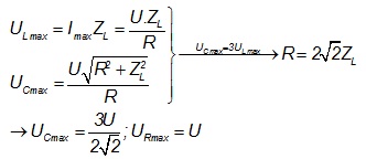 Cho mạch điện xoay chiều như hình vẽ. Điện dung C có giá trị thay đổi được và cuộn dây thuần cảm. Điều chỉnh giá trị của C và ghi lại số chỉ lớn nhất trên từng vôn kế thì thấy UCmax = 3ULmax. Khi đó UCmax gấp bao nhiêu lần URmax?