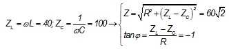 Một mạch điện gồm R=60 (Ω), cuộn cảm thuần có độ tự cảm L=0,4/π (H) và tụ điện có điện dung C=10-4/π (F) mắc nối tiếp, biết f=50(Hz) tính tổng trở trong mạch, và độ lệch pha giữa u và i