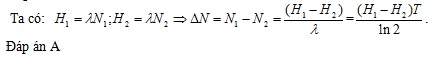 Một mẫu chất phóng xạ có chu kì bán rã T. Ở các thời điểm t1 và t2 (với t2 > t1) kể từ thời điểm ban đầu thì độ phóng xạ của mẫu chất tương ứng là H1 và H2. Số hạt nhân bị phân rã trong khoảng thời gian từ thời điểm đến thời điểm bằng: