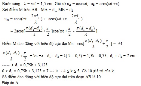 Hai nguồn kết hợp A và B dao động ngược pha nhau, cách nhau một đoạn 7 cm dao động với tần số 40 Hz, tốc độ truyền sóng là 0,6 m/s. Số điểm dao động với biên độ cực đại trên đoạn AB là