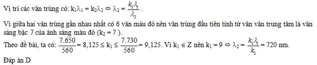 Trong thí nghiệm Y-âng về giao thoa ánh sáng, nguồn sáng phát đồng thời hai bức xạ đơn sắc: bức xạ λ1=560 nm và bức xạ màu đỏ có bước sóng λ2 (λ2 nằm trong khoảng từ 650 nm đến 730 nm). Trên màn quan sát, giữa hai vân sáng gần nhau nhất và cùng màu với vân sáng trung tâm có 6 vân sáng màu đỏ. Giá trị của λ2 là