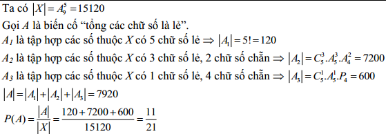 Gọi X là tập hợp các số tự nhiên gồm năm chữ số đôi một khác nhau được tạo thành từ các chữ số 1,2,3,4,5,6,7,8,9. Chọn ngẫu nhiên mật số từ tập hợp X . Tính xác suất để số được chọn có tổng các chữ số là một số lẻ.
