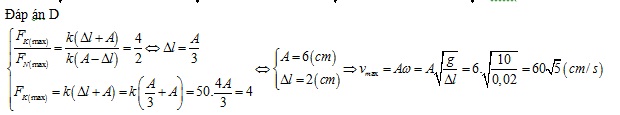 Một con lắc lò xo treo thẳng đứng tại nơi có gia tốc g = 10 m/s2, lò xo có độ cứng k = 50 N/m. Khi vật dao động thì lực kéo cực đại và lực nén cực đại của lò xo lên giá treo vật lần lượt là 4 N và 2 N. Vận tốc cực đại của vật trong quá trình dao động là