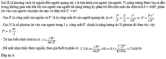 Một nguồn sáng có công suất 2 W phát ra chùm sóng ánh sáng có bước sóng 0,597 µm tỏa ra đều theo mọi hướng. Một người đứng từ xa quan sát nguồn sáng. Biết rằng con ngươi mắt có đường kính khoảng 4 mm và mắt còn thấy nguồn sáng khi có ít nhất 80 photon phát ra từ nguồn này lọt vào con ngươi trong mỗi giây. Bỏ qua sự hấp thụ ánh sáng của khí quyển. Khoảng cách xa nhất mà người này còn trông thấy được nguồn sáng là