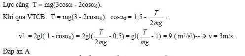 Một con lắc đơn có chiều dài dây treo ℓ = 45 cm, khối lượng vật nặng là m = 100 g. Con lắc dao động tại nơi có gia tốc trọng trường g = 10 m/s2. Khi con lắc đi qua vị trí cân bằng, lực căng dây treo bằng 3 N. Tốc độ của vật nặng khi nó đi qua vị trí này là