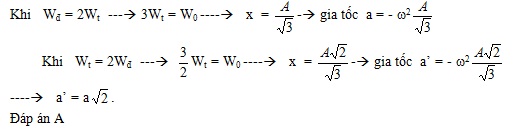 Một vật đang dao động điều hòa. Tại vị trí động năng bằng hai lần thế năng, gia tốc của vật có độ lớn a. Tại vị trí mà thế năng bằng hai lần động năng thì gia tốc của vật có độ lớn bằng