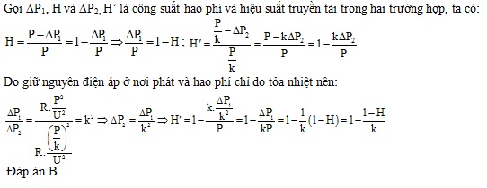 Điện năng được truyền từ nơi phát đến một khu dân cư bằng đường dây một pha với hiệu suất truyền tải là H. Coi hao phí điện năng chỉ do tỏa nhiệt trên đường dây. Nếu công suất truyền tải giảm k lần so với ban đầu và giữ nguyên điện áp ở nơi phát thì hiệu suất truyền tải điện năng trên chính đường dây đó là