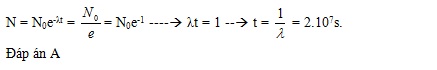 Giả thiết một chất phóng xạ có hằng số phóng xạ là l = 5.10-8s-1. Thời gian để số hạt nhân chất phóng xạ đó giảm đi e lần (với lne = 1) là