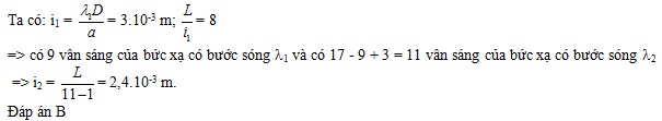 Một nguồn sáng điểm nằm cách đều hai khe Y-âng và phát ra đồng thời hai bức xạ đơn sắc có khoảng vân giao thoa cm và chưa biết. Trên màn quan sát và trong một khoảng rộng L = 2,4 cm trên màn đếm được 17 vân sáng trong đó có 3 vạch là kết quả trùng nhau của hai hệ vân. Biết hai trong ba vạch trùng nhau nằm ngoài cùng của khoảng L. Khoảng vân là