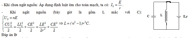 Một mạch dao động LC lí tưởng gồm tụ điện có điện dung C và cuộn cảm thuần có độ tự cảm L. Nối hai cực của nguồn điện một chiều có điện trở trong r vào hai đầu cuộn cảm. Sau khi dòng điện trong mạch ổn định, cắt nguồn thì mạch LC dao động với hiệu điện thế cực đại giữa hai bản tụ gấp n lần suất điện động của nguồn điện một chiều. Chọn hệ thức đúng.
